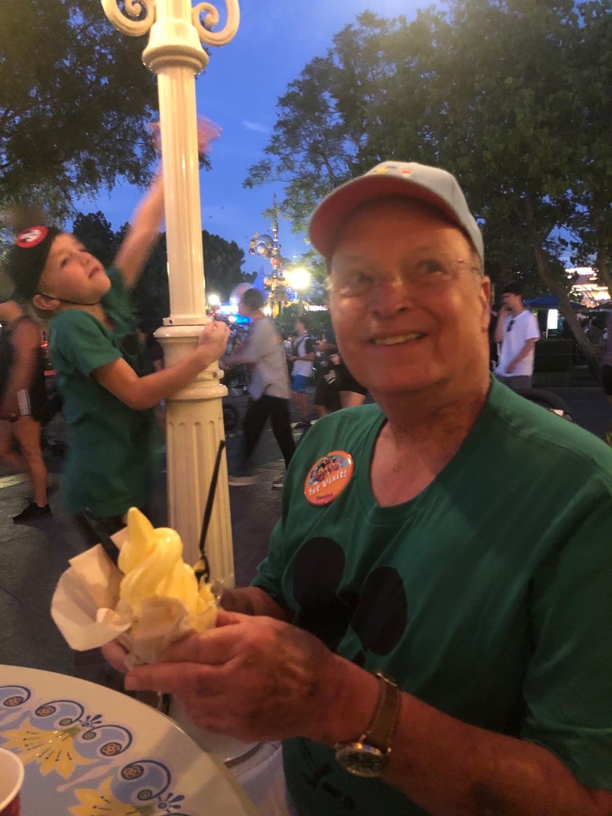 | We made sure we got to this place right at 7 for the 9pm fireworks. Dad posted up here with his dole whip so we'd have a great seat for the fireworks!! |